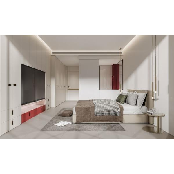 Transform your bedroom with the Fadior Stainless Steel Full-Height Wardrobe Cabinet. This elegant design maximizes storage with its floor-to-ceiling structure while seamlessly integrating a TV for modern convenience. The wardrobe’s sleek beige finish is complemented by bold red accents, adding a lively touch to the minimalist aesthetic. On the opposite side, a sophisticated vanity unit features curved open shelves and a built-in illuminated mirror with a stylish wash basin. Crafted entirely from premium stainless steel, this wardrobe guarantees exceptional durability, water and corrosion resistance, and easy maintenance, embodying Fadior's commitment to quality and innovation in full-house customization.